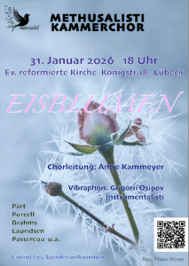 Der Chor Methusalisti gibt unter der Leitung von Antje Kammeyer ein Winterkonzert namens „Eisblumen“. Frostige Klänge wechseln sich mit von innen wärmenden musikalischen Farbtupfen ab. Es erklingen anspruchsvolle a-cappella-Werke unterschiedlicher Epochen, darunter z.B. Werke von Henry Purcell, Morten Lauridsen und dem gerade 90 Jahre alt gewordenen Arvo Pärt. In den Winterklang fügen sich außerdem Werke für Vibraphon, gespielt von Gregorii Osipov. Dieses Konzert wird eine tröstliche Hilfe beim Warten auf den Frühling sein…